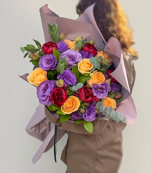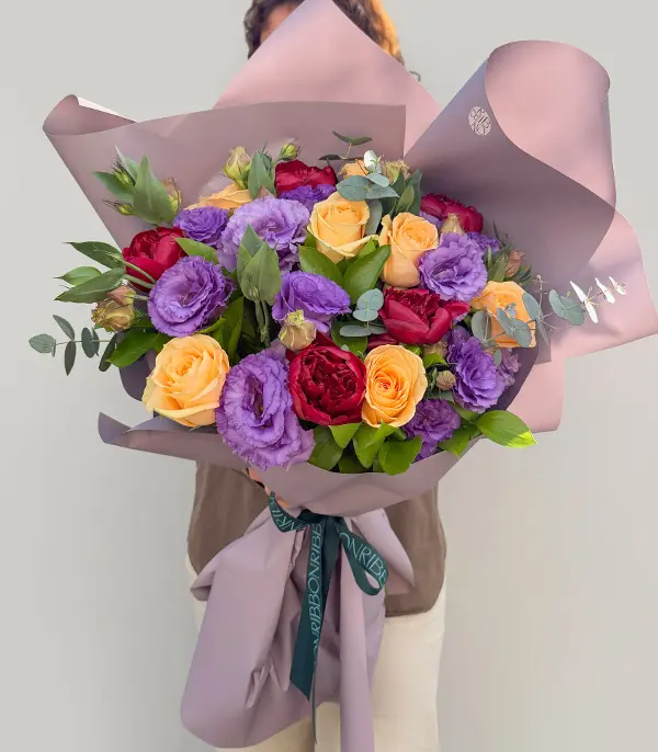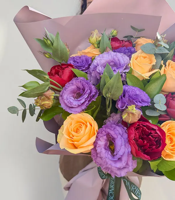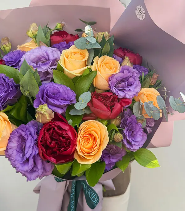 Bordo şakayıklar, kayısı güller, lila lisyantuslar, okaliptuslar ile dizayn edildi. Sizin için mevsimin en güzel ve taze çiçeklerini her zaman özenle seçiyoruz, bununla birlikte arajmanlarımızın çiçekleri ve renkleri mevsime ve tasarım uygunluğuna göre değişiklik göstermektedir.